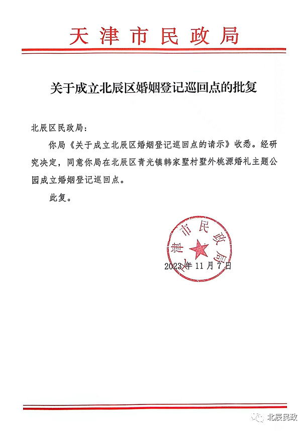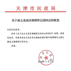 为深入贯彻全市婚俗改革工作会议精神,推进婚姻领域移风易俗,天津市北辰区民政局在墅外桃源婚礼主题公园内成立天津市北辰区民政局墅外桃源婚姻登记处,为群众提供结婚登记、颁证等服务,坚持重登记、强责任、展文明、崇节俭的工作宗旨,打造“美丽、生态、文明”的婚姻登记与婚俗文化公园,打造成具有北辰区特色的婚姻文化传播平台和婚俗改革示范点。