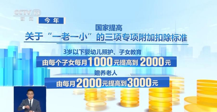 据了解,个人所得税专项附加扣除政策,也在不断进行调整和优化。比如今年,国家就提高了关于“一老一小”的三项专项附加扣除标准。其中3岁以下婴幼儿照护、子女教育,由每个子女每月1000元提高到2000元。赡养老人,由每月2000元提高到3000元,进一步减轻纳税人负担。