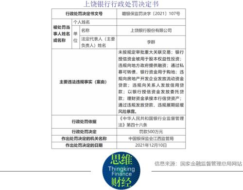 行政处罚决定书显示,上饶银行因存在未按规定审批重大关联交易;银行授信资金被用于股本权益性投资;违规向地方政府提供融资;通过私募可转债,银行资金用于购地;违规向房地产开发企业发放流动资金贷款;违规向关系人发放信用贷款;以银行授信资金发放委托贷款;理财资金承接本行信贷资产;通过违规发放贷款、违规展期延缓风险暴露等9项违法违规问题,被处以500万元罚款,其他相关责任人也均受到不同程度惩罚。