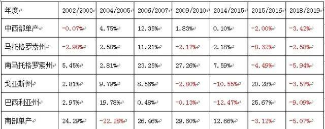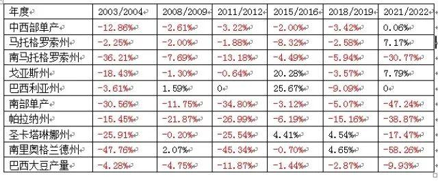 表2:2000年以来巴西中西部和南部大豆单产以及巴西全境大豆产量下降的年份(%)