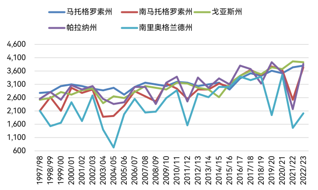南马托格罗索州在2003/2004年度单产下降也较多,减少36%,2021/2022年度也减少31%,其余年份减少不多。2003年9月至11月南马托格罗索州降雨还是偏多的,气温也在正常水平附近,但是到了12月至次年2月期间,降雨比均值减少4%,气温也处于偏高状态。2021年9月至11月降雨和气温在正常水平,但是到了12月至次年2月期间,降雨比均值减少17%,虽然气温也是均值水平,最终单产还是下降了。而在2023年9月至11月期间南马托格罗索州降雨比均值下降26%,气温也偏高。