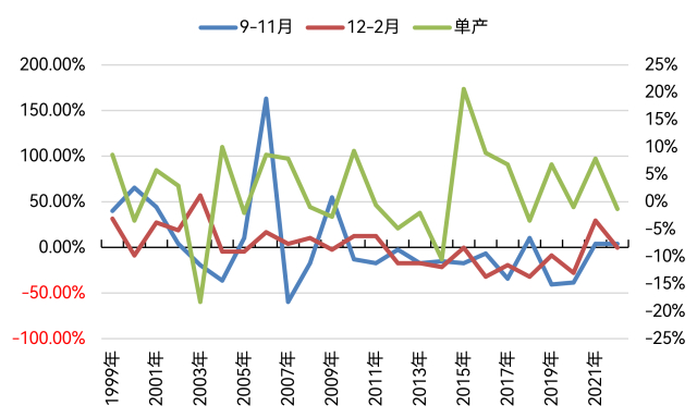 图5:巴西戈亚斯州不同时间段累计降雨距平值与单产同比变化(%)