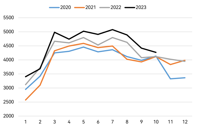 由于今年初巴西将生物柴油掺混比例从10%上调至12%,生物柴油每月消耗豆油逐步增多,因此,3月开始每月压榨量均高于2022年同期。10月份压榨425.5万吨,略低于9月的441万吨,但高于2022年同期的410.5万吨;1月至10月累计压榨4526.9万吨,比2022年同期增加230万吨,最终2023年全年压榨量也会增加200万吨以上,官方给出267万吨的增量。另外,2023年收获的大豆在起初种子消耗也比上一季增多,达到了268.4万吨。