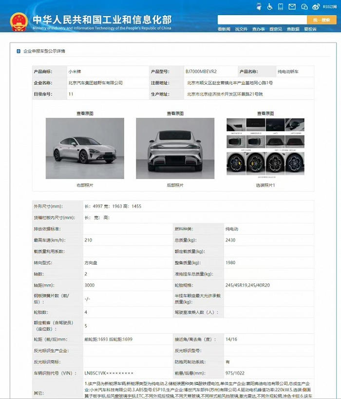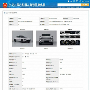 11月15日,工信部公布第377批《道路机动车辆生产企业及产品公告》新产品公示清单,小米汽车在列。清单中,小米汽车共申报了SU7和SU7 Max两个产品型号,不过外观大致相同,采用趴溜背造型、一体式天幕和贯穿式尾灯等设计元素,配色接近iPhone 15 Pro的原色钛金属,车尾还标有“北京小米”的字样。