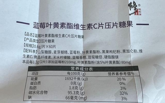 张莉购买的蓝莓叶黄素酯维生素C片压片糖果产品配料表显示:山梨糖醇、麦芽糊精、蓝莓粉、叶黄素酯粉、黑果枸杞粉、黑加仑粉、维生素C、微晶纤维素、无水柠檬酸、蓝莓香精、阿斯巴甜(含苯丙氨酸)、硬脂酸镁。此外,每1.2克(2片)添加蓝莓粉210mg、叶黄素酯粉(含5%叶黄素酯)80mg。