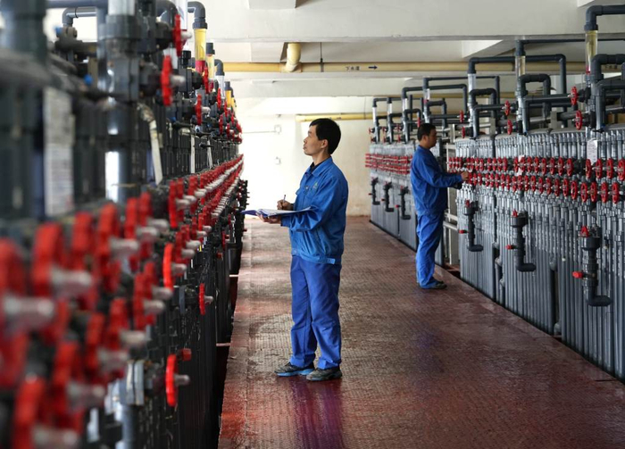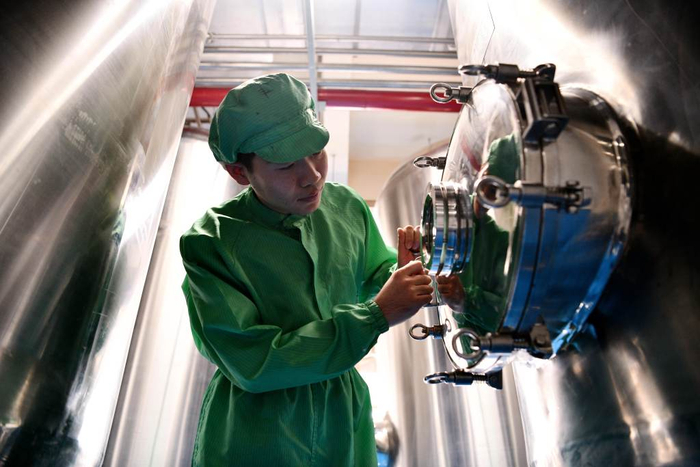 近年来,石家庄市栾城区大力发展生物医药产业。12月12日,工作人员在石家庄市栾城区神威药业集团的中药提取车间巡检。 新华社记者 王晓 摄