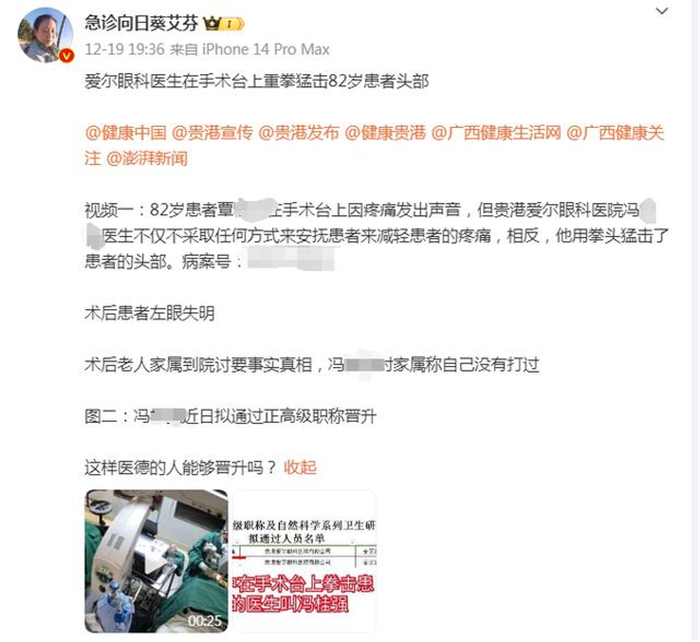 帖文称,“82岁的患者覃某某在手术台上因疼痛发出声音,但贵港爱尔眼科医院医生冯某某不仅不采取任何措施安抚患者减轻疼痛,相反,他用拳头猛击了患者的头部。术后,患者左眼失明。”