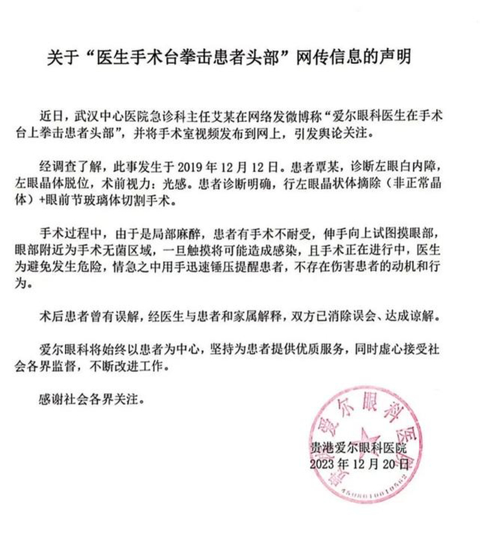 12月21日凌晨,贵港爱尔眼科医院通报:近日,武汉中心医院急诊科主任艾某在网络发微博称“爱尔眼科医生在手术台上拳击患者头部”,并将手术室视频发布到网上,引发舆论关注。
