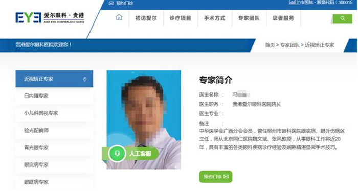 在贵港爱尔眼科医院官网搜索发现,冯某某系贵港爱尔眼科医院院长,职称为副主任医师,擅长近视眼激光手术、ICL近视手术、眼底病、视网膜脱离等方面的手术。