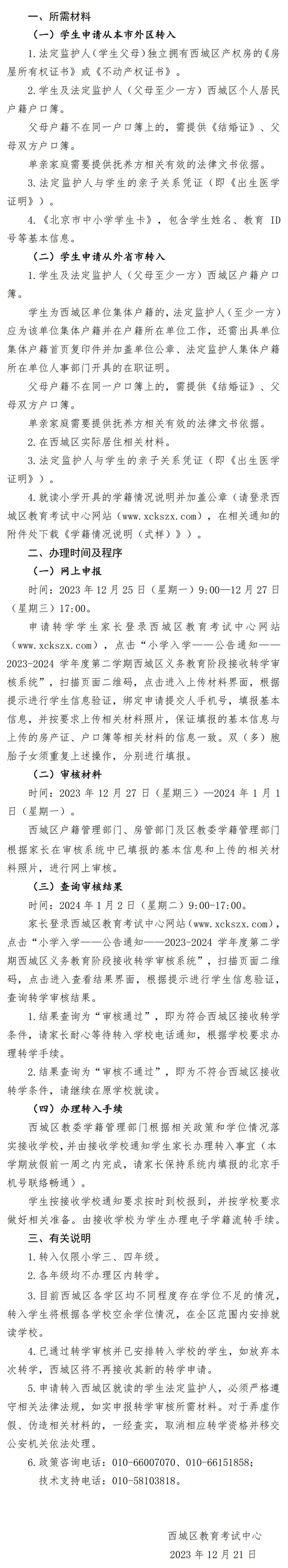 12月21日,西城区教育考试中心发布《2023-2024学年度第二学期西城区义务教育阶段公办学校接收转学申请工作安排》,明确转学网上申报时间为2023年12月25日(星期一)9时-12月27日(星期三)17时。