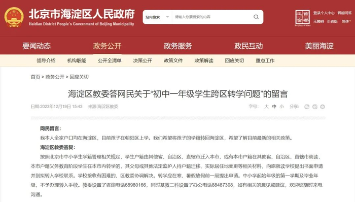 海淀区教委答网民关于“初中一年级学生跨区转学问题”的留言