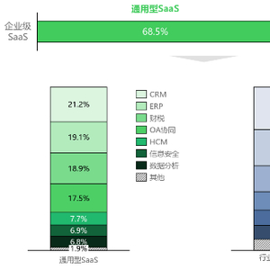 SaaS按应用领域可分为通用型和行业垂直型。行业垂直型SaaS相比通用型SaaS一般只专注于某几个下游行业。从2022年的市场分布情况看,中国企业级SaaS中通用型和行业垂直型的占比为68.5%和31.5%。其中通用型SaaS主要由营销科技类、供应链管理类、职能提效类和新兴技术类组成,CRM、ERP和财税类软件是前三大类别,而行业垂直型SaaS中,前五大应用行业是零售电商、医疗、房产、物流和餐饮。