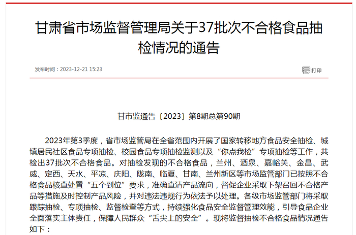 甘肃省市场监督管理局关于37批次不合格食品抽检情况的通告