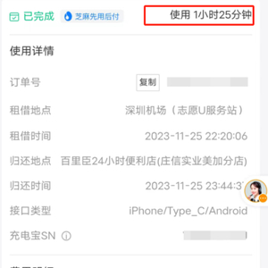 “11月25日,我在深圳机场用支付宝扫码租借了一个街电品牌的共享充电宝,用了不到半小时就没电了,当时附近没柜机无法及时归还,但充电宝订单却还在持续计费。”曾先生对记者说,他归还充电宝后,显示使用时长是1小时25分钟,扣费6元。曾先生表示:“只充电半小时,却按照1小时甚至更久的时间扣款,我不认可这些费用。”