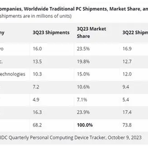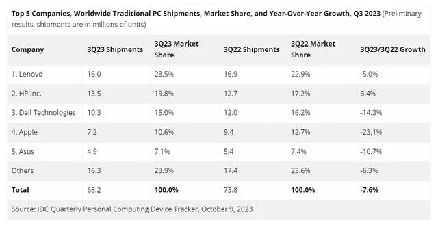 IDC最新统计数据显示,2023年Q3全球PC市场出货量为6820万台,虽同比仍下滑了7.6%,但相较于今年一二季度29.0%、13.4%的降幅已经持续收窄。