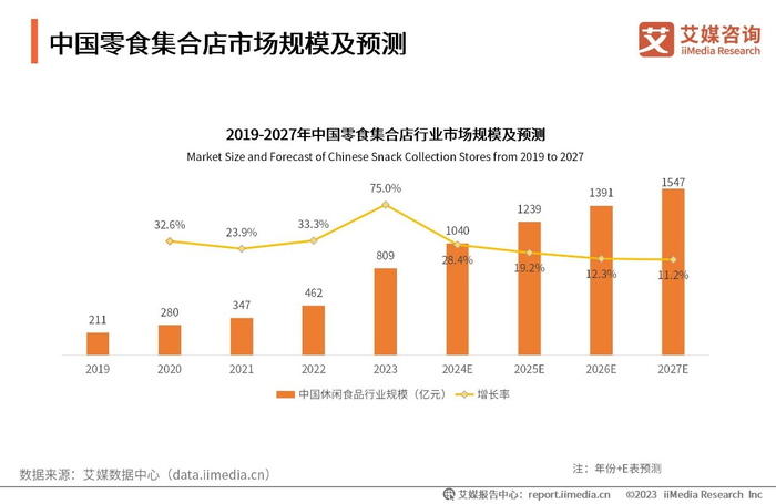 线上线下表现堪忧的背后,是零食消费习惯的更迭。艾媒咨询数据显示,2023年中国休闲零食行业规模约为11247亿元,同比下降3.5%,自2010年以来首次出现负增长。预计2024-2027年,市场增速将保持在3%以内,赛道天花板清晰可见。而以便捷、多样、性价比著称的零食集合店细分领域,2023年却逆势增长75%至809亿元,预计2025年有望达到1239亿元。
