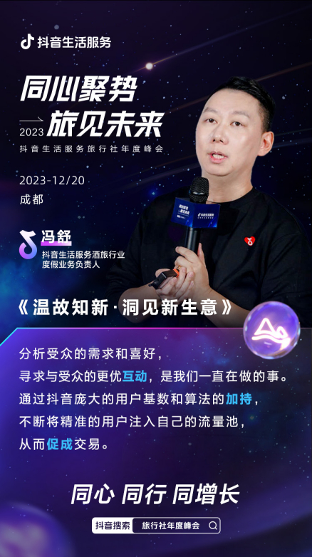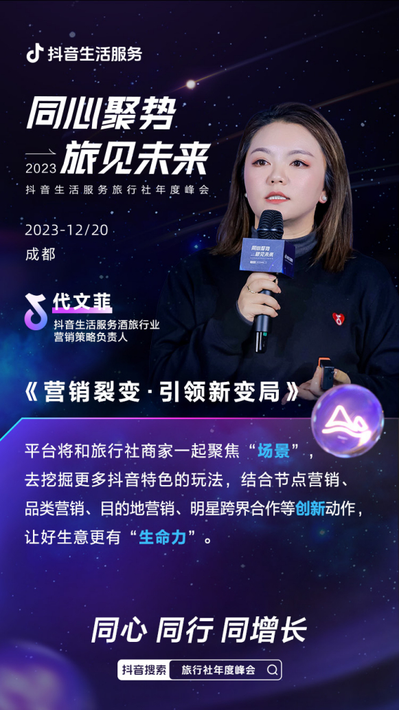 面对越来越多生态伙伴的入驻,抖音生活服务在2023年12月20日举办“同心聚势,旅见未来”旅行社年度峰会,借由活动契机,向更多生态伙伴展示平台在2023年深耕旅行社业务的产品功能、营销玩法、发展布局,以及2023年行业数据成果回顾,并对即将到来的2024年收集声音、进行展望。