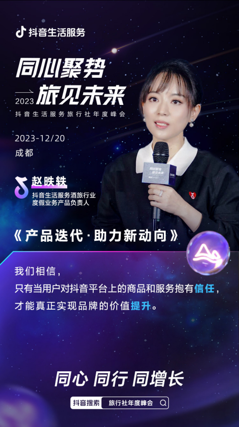 随着抖音生活服务旅行社年度峰会圆满落幕,未来平台将携手更多的旅行社和旅行度假商家,继续用心发掘城市的魅力,激活旅行消费活力,打造更多创新玩法,解锁更多经营地图,让更多商家在平台“旅”见未来,让用户“旅”出新意,向着“价格透明,服务放心,用户满意”的更好生态而努力。