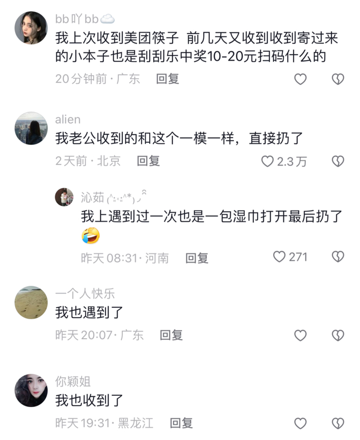和“年终遇见礼”类似,近期“淘宝网年度盛典”“京东年度盛典”的快递也在全国各地陆续出现,除了相似的“感谢信”和“刮刮卡”,有的包裹还附上筷子、纸巾等小礼品。