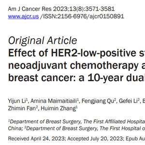 [12]Li Y, Maimaitiaili A, Qu F, Li G, Shi B, Wang Y, Zhang J, He J, Fan Z, Zhang H. Effect of HER2-low-positive status on neoadjuvant chemotherapy and survival outcome of breast cancer: a 10-year dual-center retrospective study. Am J Cancer Res. 2023 Aug 15;13(8):3571-3581. PMID: 37693150; PMCID: PMC10492098.