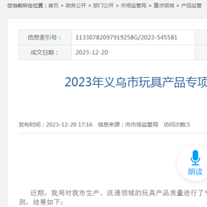 2023年浙江省义乌市玩具产品专项监督抽查结果信息发布