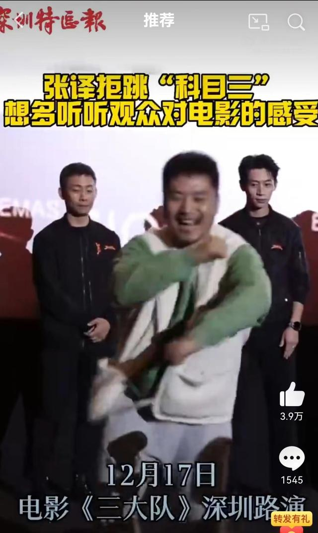 电影《三大队》深圳路演时,有观众谈完观影感受之后,突然扭转话题,说想和主创们一起跳当下正流行的“科目三”。在主持人已经推动这个环节时,张译明确表示拒绝,“我还是很想听一听深圳的观众对这部电影深度的解读,如果我们把这个时间放在跳舞上,我希望闲暇的时间可以陪大家玩,今天这个场合你们觉得合不合适?”听到台下观众齐声喊“不合适”,他说,“我们特别想听一下现场观众对这部电影和我们一样或者不一样的感受”,并把话筒重新递给主持人,让路演可以继续聊电影。