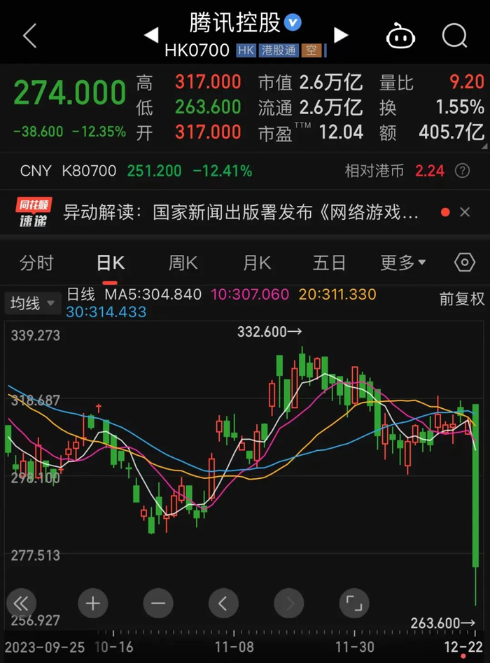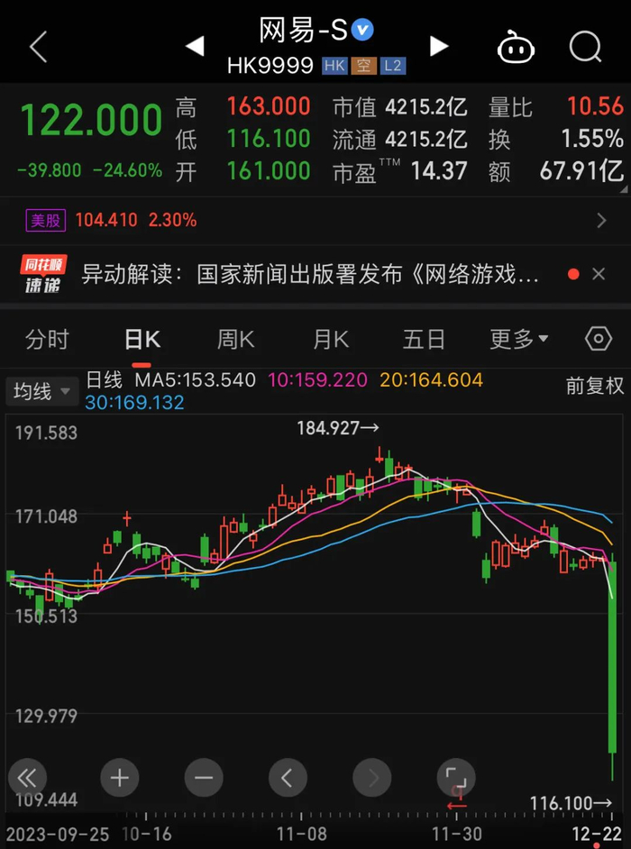 12月22日,网易报收122港元,跌幅24.60%;腾讯控股报收274港元,跌幅12.35%。哔哩哔哩、网龙、祖龙娱乐、三七互娱、创梦天地等港股、A股相关游戏股均大跌。