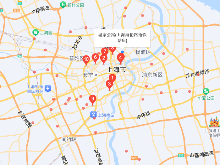 其中城家公寓在上海布局较广,百度地图上目前一共能够搜索出49家店,遍布上海郊区市区