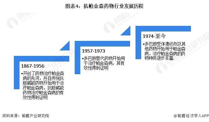 目前,抗帕金森病药物已发展至第三代,其中:第一代为抗胆碱能药物,第二代为以左旋多巴为代表的多巴胶替代药物,第三代为多巴胺受体激动剂及其他药物(B型单胺氧化酶抑制剂、COM抑制剂等)。