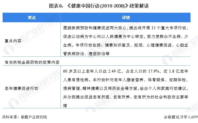 《健康中国行动(2019-2030)》提出针对老年人膳食营养、体育锻炼、定期体检、慢病管理、精神健康以及用药安全等方面,给出个人和家庭行动建议,并分别提出促进老有所医、老有所养、老有所为的社会和政府主要举措。而帕金森疾病多发于老年人。