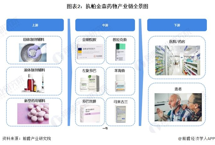 抗帕金森药物研发上游基础化工原料、医药中间体、药用辅料等行业,其中药用辅料包括固体制剂辅料、液体制剂辅料和新型药用辅料。中游按照产品分类可分为金刚烷胺、普拉克索、左旋多巴、苯海索、多巴丝肼、司来吉兰等。下游目标客户主要为医院药房和患者等。