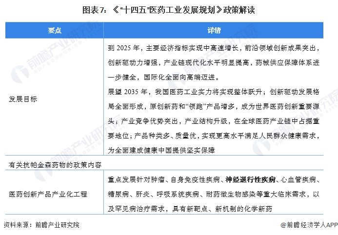 依据《“十四五”生物经济发展规划》,我国将积极利用云计算、大数据、人工智能等信息技术,对治疗适应症与新靶点验证、临床前与临床试验、产品设计优化与产业化等新药研制过程进行全程监管,实现药物产业的精准化研制与规模化发展。《发展规划》关于抗帕金森药物产业的相关摘录如下表: