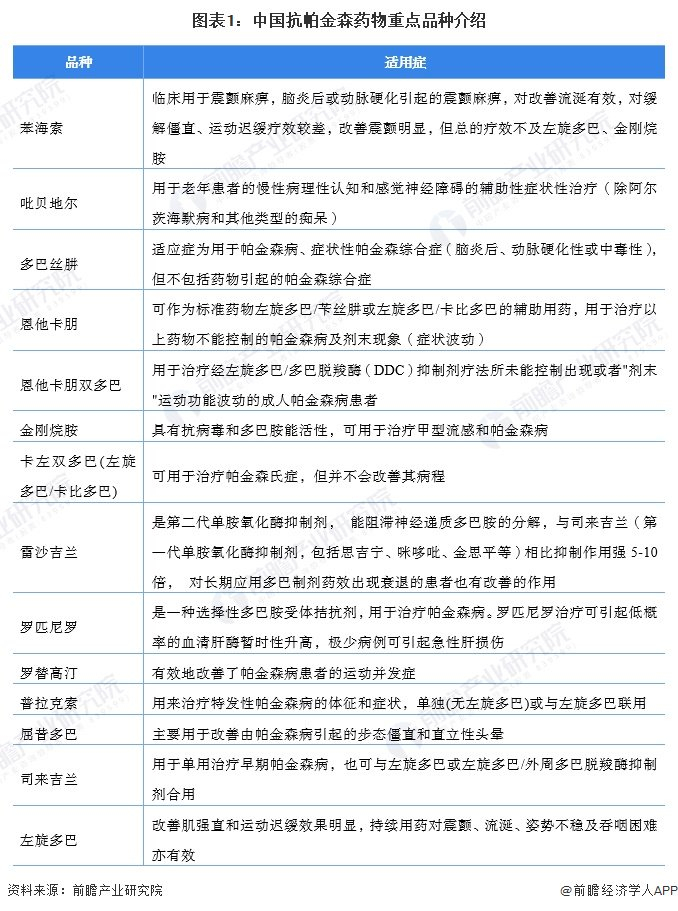 目前,我国抗帕金森药物主要包括苯海索、吡贝地尔、多巴丝肼、恩他卡朋、恩他卡朋双多巴、金刚烷胺、卡左双多巴(左旋多巴/卡比多巴)、雷沙吉兰、罗匹尼罗、罗替高汀、普拉克索、屈昔多巴、司来吉兰、左旋多巴等品种。