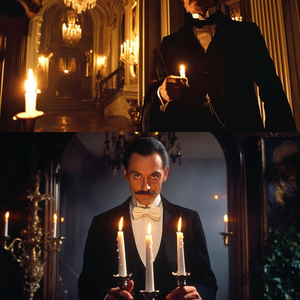 主要提示词:1980年代的悬疑电影,仰拍,身穿黑西装的法国管家在维多利亚式豪宅的走廊中手握蜡烛