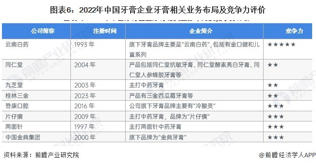 由于中国牙膏市场格局分散,业内代表企业市场份额占比均不高,结合代表企业牙膏业务发展概况,及企业注册资本、经营市场等指标对其竞争力进行评价如下: