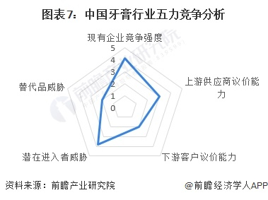 根据以上分析,对各方面的竞争情况进行量化,5代表最大(竞争激烈/威胁大/议价能力强),0代表最小(竞争小/威胁小/议价能力弱),牙膏产业的竞争情况如下图所示。