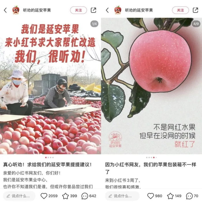 作为一个之前在大众知名度并不算太高的水果品种,延安苹果的商家们用小红书独有的方式发帖求销售建议,引发用户自发献计献策,最后他们真的将网友的写的一些广告词印到了包装上。