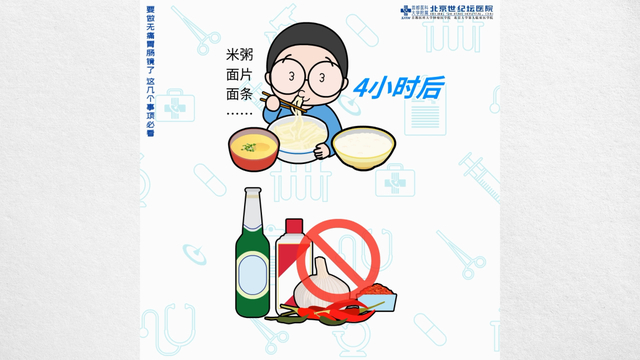4个小时后可以吃流质或半流质饮食,不能饮酒,吃辛辣刺激食物或难消化的食物。