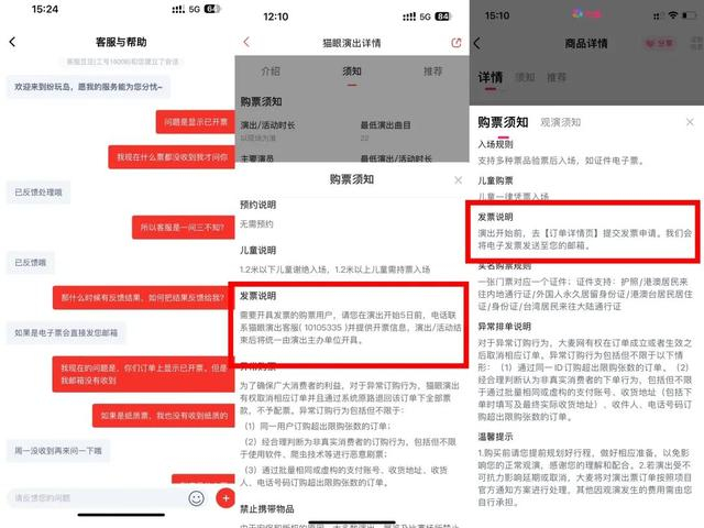 大麦和猫眼客服均告诉澎湃新闻记者,若用户急需发票,客服会尝试帮忙登记催促,进行反馈,但无法保证开票速度,只能以页面显示的发票开具时间为准。从记者与客服的沟通来看,每个项目的规则并不一样,需要具体来看,几乎没有遇到演出之前开发票的。