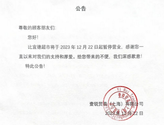 12月23日上午,“比宜德”微信公众号发布推送,称比宜德超市于2023年12月22日起暂停营业。消息在互联网上传播,有的老顾客震惊:“怎么说没就没了?”有的网友一头雾水:“比宜德是啥?怎么没听说过?”