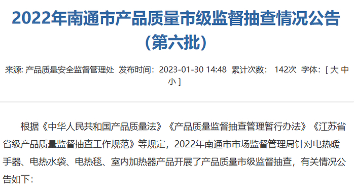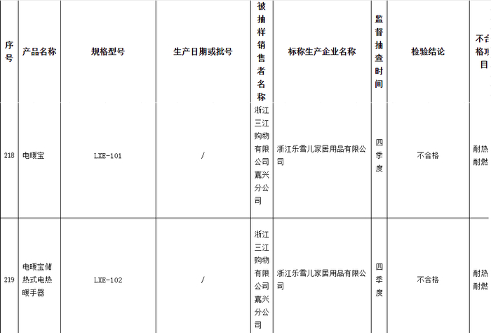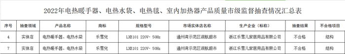 根据嘉兴市市场监督管理局、南通市市场监督管理局、西藏自治区市场监督管理局、宁波市市场监督管理局、台州市市场监督管理局发布的产品监督抽查信息,标称由浙江乐雪儿家居用品有限公司生产、受检单位为浙江三江购物有限公司嘉兴分公司、宁波海曙永佰超市等的7批次电热暖手器相关产品,涉及商标为“乐雪兒”,涉及产品为电暖宝、储热式电热暖手器、电热暖手器、电热水袋硅胶电热水袋(LXE-101、LXE-102、LXE-8007等7批次)不合格,涉及项目为耐热和耐燃、结构、对触及带电部件的防护、输入功率和电流。