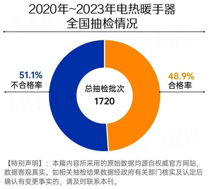 抽检数据显示,过去三年间,国家、省市级监管部门共抽检1720批次电热暖手器,其中879批次不合格,合格率仅为48.9%。