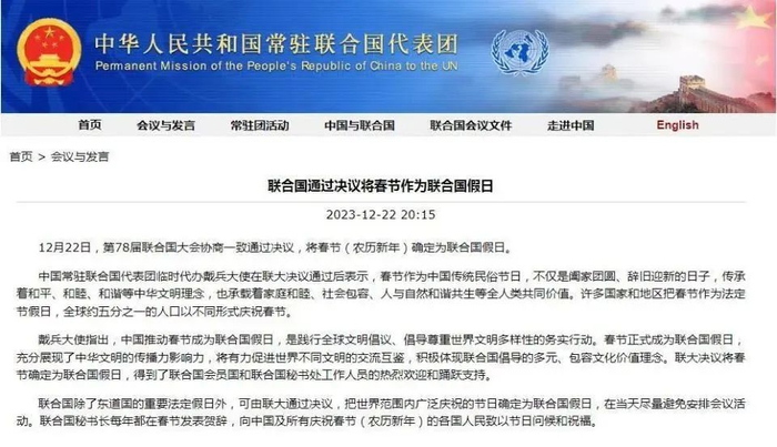 12月22日,第78届联合国大会协商一致通过决议,将春节(农历新年)确定为联合国假日。