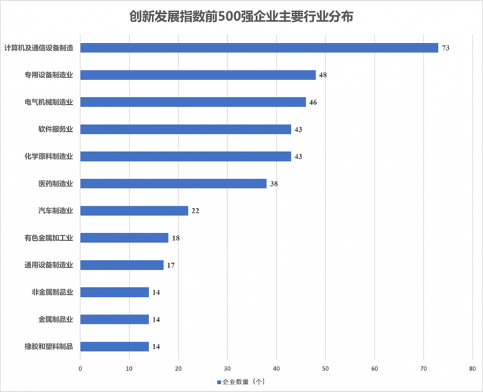 从创新发展指数500强企业的行业分布看,共有6个行业的创新指数500强企业数量超过30家。