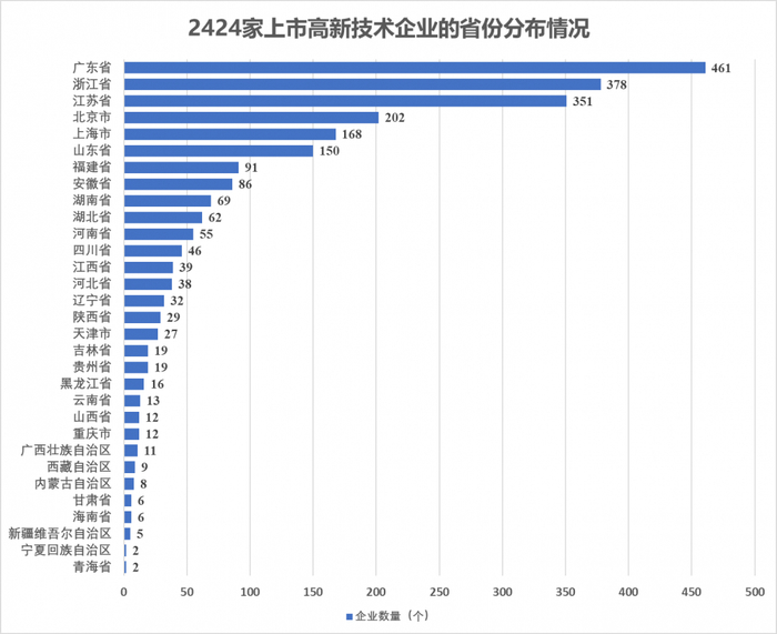从遴选出的2424家上市高新技术企业可见,广东省数量最多,其次是浙江省、江苏省和北京市。四个省市企业数量占全国样本的比例接近六成。