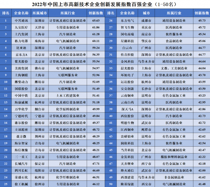 中国上市高新技术企业创新发展水平前100强中,中兴通讯以65.63分位列第一,九安医疗、上汽集团、格力电器、比亚迪分列第二、三、四、五位,创新发展指数分别为61.86、61.28、60.11、59.24。