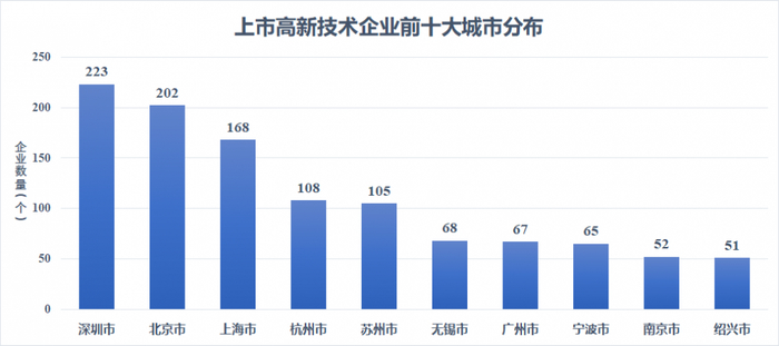 从具体城市看,中国上市高新技术企业基本分布在长三角和珠三角地区的城市。其中,江苏省有3座城市,浙江省有3座城市,广东省有2座城市。