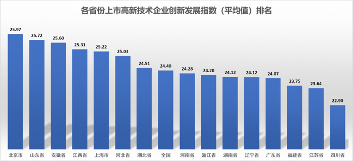 从上市高新技术企业创新发展平均值的省份排名情况来看,北京市位居首位,山东省、安徽省、江西省、上海市、河北省、湖北省均高于全国平均创新水平。广东省位列全国第十二名,省内企业创新发展有待进一步提升。