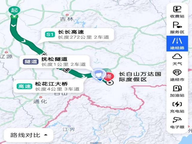 到此处可从长春南收费站驶入长长高速公路(S1)、鹤大高速公路(G11)一路向南行驶,途经新立城停车服务区、辉南服务区(可加油、就餐)、抚民服务区(可加油)、靖宇服务区(可加油、就餐)、长白山服务区(可加油),从长长高速公路(S1)东岗收费站驶出,沿504国道经白云路行驶5.8公里到达长白山万达国际旅游度假区。