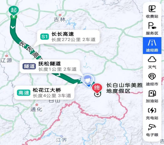 到此处可从长春南收费站驶入长长高速公路(S1)、鹤大高速公路(G11)一路向南行驶,途经新立城停车服务区、辉南服务区(可加油、就餐)、抚民服务区(可加油)、靖宇服务区(可加油、就餐)、长白山服务区(可加油),从长长高速公路(S1)东岗收费站驶出,沿504国道直行20公里到达长白山华美胜地旅游度假区。